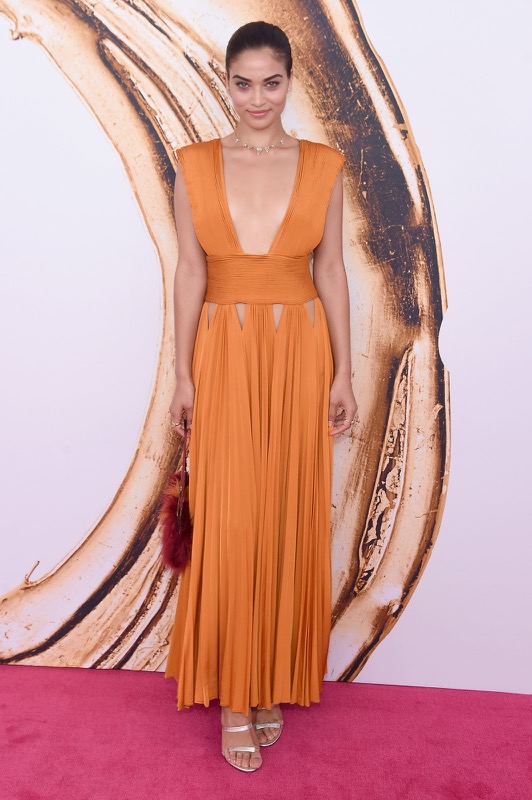 Dato l’abito che risplende di luce propria, sexissimo, in stile sottoveste, il suo trucco, a differenza di molti altri che abbiamo visto fino ad ora, ha un finish mat. Sugli occhi vediamo un leggero smokey sul marrone con un punto luce sui toni dell’oro nell’angolo interno dell’occhio.