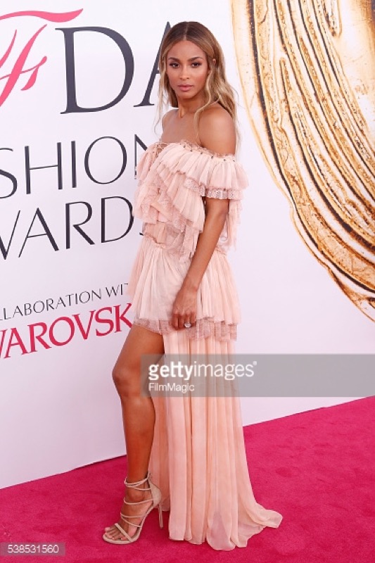Con questo abito Ciara ricorda molto una lolita uscita da un fumetto manga. Il taglio particolare, corto davanti e lungo dietro, e le balze presenti lo rendono al contempo sexy e romantico (il color rosa antico aiuta)!
