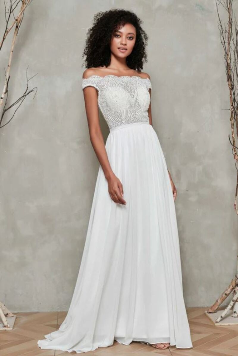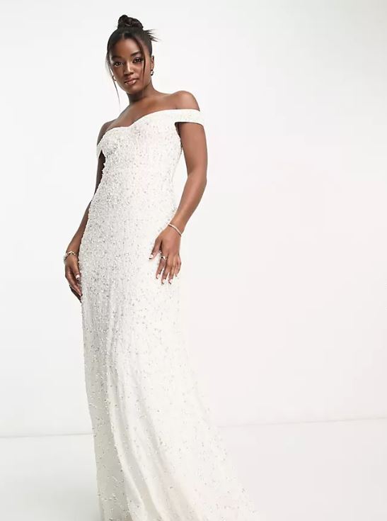 Maya, Vestito lungo da sposa color avorio decorato con scollo alla Bardot e fondo a sirena, Prezzo 232,99 € su asos.com