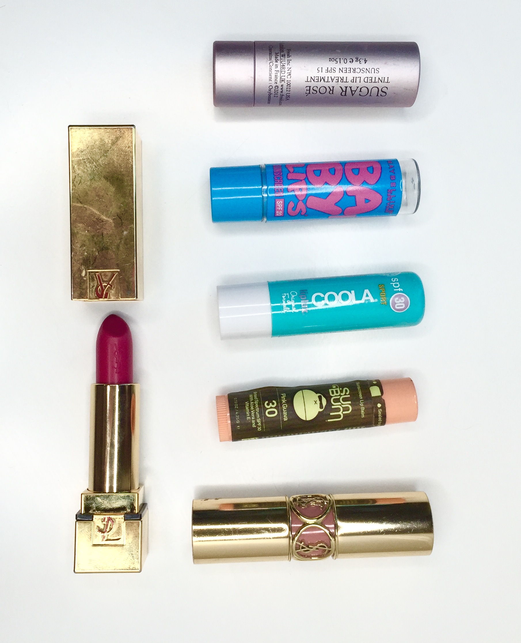 Infatti, come potete vedere dalla foto possiedo 4 burrocacao con protezione solare: un Babylips della Maybelline, uno della Fresh, uno della Coola e uno della Sun Bum. I rossetti invece sono solamente due e sono davvero rari.