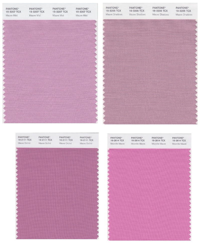__Mauve_pantoneLa Pantone non ha un solo color malva (o Mauve, come si dice in inglese). Dall’alto a destra, in senso orario, trovate: Mauve Mist, Mauve Shadows, Moonlite Mauve e Mauve Orchid.